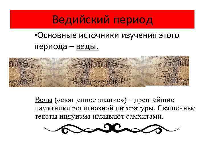Ведийский период • Основные источники изучения этого периода – веды. Веды ( «священное знание» ) – древнейшие памятники религиозной литературы. Священные тексты индуизма называют самхитами.