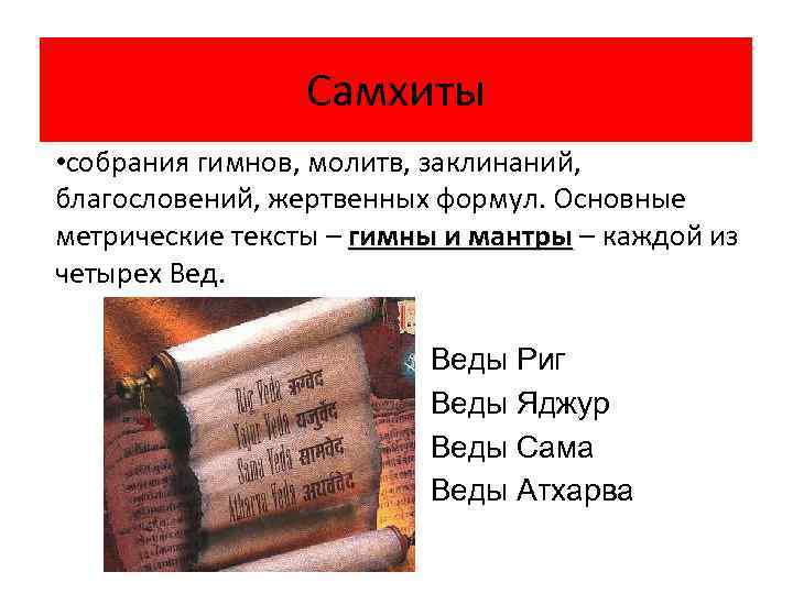Самхиты • собрания гимнов, молитв, заклинаний, благословений, жертвенных формул. Основные метрические тексты – гимны и мантры – каждой из гимны и мантры четырех Веды Риг Веды Яджур Веды Сама Веды Атхарва