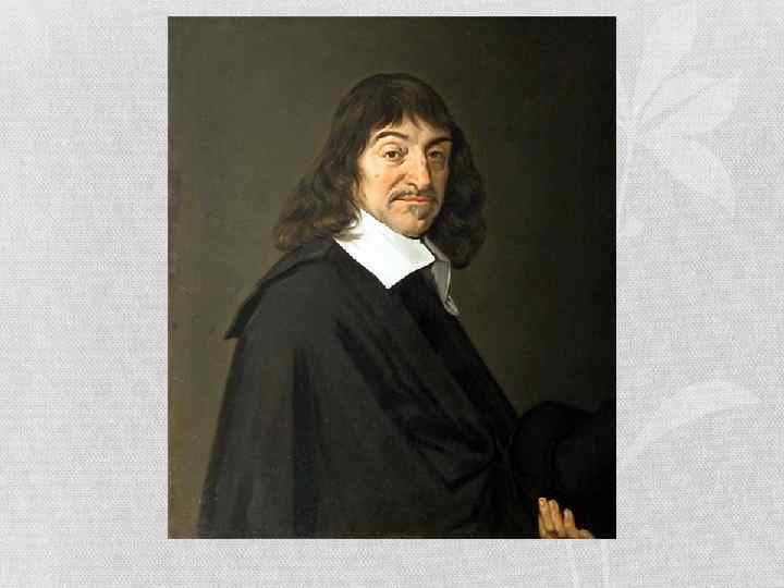 Рене Декарт • Рене Декарт (1596— 1650) — французский математик и философ. Если Френсис Бэкон рассматривал опыт как основную отправную точку исследования, а Т. Гоббс привнес в эту логику математику, то Декарт ставил во главу всего разум, а опыт считал лишь инструментом, подтверждающим выводы разума. Декарт придерживался рационализма. Впервые ввел идеи эволюции, но доказывал их исходя исключительно из механистических представлений. • Основной отправной точкой его философии является понятие субстанции, здесь он сближается с античными философами. В этом вопросе он придерживается дуализма, разделяя субстанцию на два вида: материальную, бесконечно делимую, которую можно описать механическими представлениями, и неделимую духовную, постижимую только человеком, поскольку лишь у него есть бессмертная душа. Субстанции обладают двумя главными атрибутами: протяженностью, для материальной, и мышлением, для духовной (идеальной). Духовный мир человека есть нечто врожденное. К врожденным идеям Декарт относит идею Бога и основы математики и логики ( «две величины, равные третьей, равны между собой» , «из ничего не происходит» ). Считает, что все сущее создал Бог, но после создания он не вмешивается в естественный ход истории.
