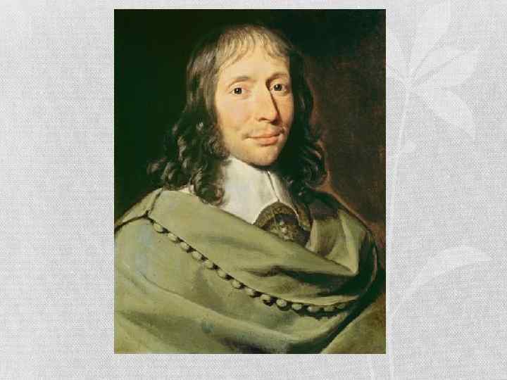 Блез Паскаль • Блез Паскаль (1623— 1662) — знаменитый французский философ, физик, математик и писатель. Плодотворно поработав в области естествознания и математики (он является одним из «отцов» теории вероятностей), он разочаровался в них и перешел к изучению религии и философской антропологии. Он считал, что «доводы разума» , постоянно колеблющегося между сомнениями и уверенностью, ниже «доводов сердца» . • «Природа ставит в тупик скептиков, разум — догматиков; догматик не может справиться с непреодолимой слабостью разума, а скептик не может справиться с непреодолимой идеей истины. » • Он выводил основные идеи христианства из традиционного синтеза космологии и метафизики аристотелевского толка. Указывал на незначительность человека, но в то же время и возвышал его из-за способности мыслить: • «Пространство Вселенной поглощает меня, как точку; мыслью же я объемлю всё. »