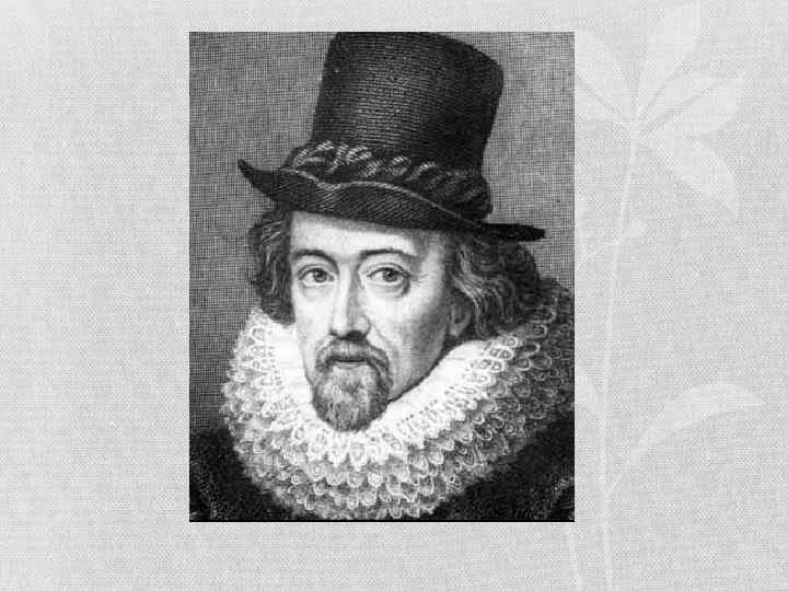 Френсис Бэкон • Первым исследователем природы в Новое время был английский философ Френсис Бэкон (1561— 1626). Он считается основоположником методологии экспериментального естествознания. Указал на значимость опыта в постижении истины. Считал, что философия должна носить практический характер, и что высшей целью философии является господство человека над природой, а «господствовать над природой можно, только подчиняясь её законам» . Постижение законов природы возможно путём анализа и обобщения отдельных проявлений, то есть исходил из индукции. Считал, что для постижения истины необходимо освободиться от мешающих этому «призраков» (идолов). «Призрак рода» заключается в стремлении человека описать мир по аналогии с жизнью, господствующей в обществе; «призрак пещеры» — в зависимости от своих субъективных пристрастий; «призрак рынка» ( «призрак площади» ) — в зависимости от расхожего мнения остальных; «призрак театра» — в слепом подчинении авторитетам. Был глубоко верующим человеком, разделял науку на теологию (занимающуюся изучением высшего, познать которое невозможно умом, а возможно лишь через божественное откровение) и философию (изучающую природу с помощью опыта и разума). • «Чтобы глубже проникнуть в тайны самой природы… нужно без колебания вступать и проникать во все такого рода тайники и пещеры, если только перед нами стоит одна цель — исследование истины. »