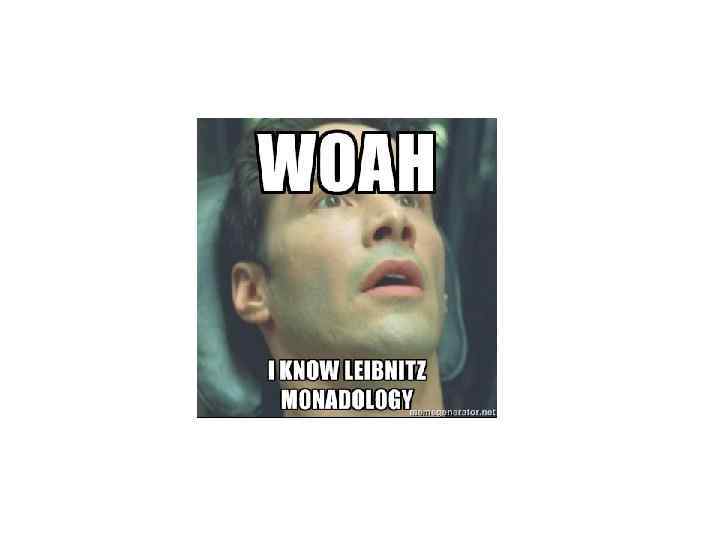 Монадология В мире нет ничего кроме монад. Монады (от греч. monados — единица) – это как бы духовные атомы, они просты, неделимы, нематериальны. Их бесконечно много и все они индивидуальны. 2 главные способности монад: восприятие и стремление. Монада — это некое внутреннее состояние, постоянно меняющееся.