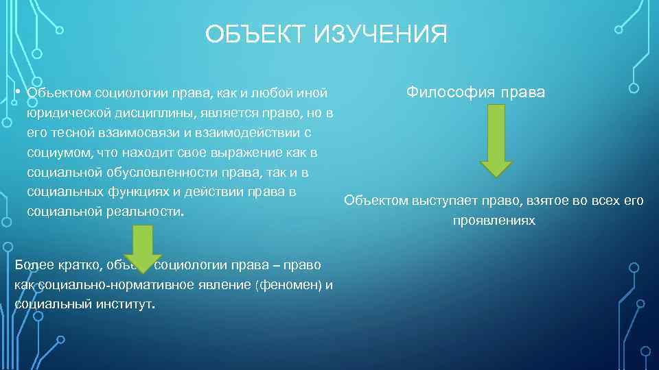 ОБЪЕКТ ИЗУЧЕНИЯ • Объектом социологии права, как и любой иной Философия права юридической дисциплины, является право, но в его тесной взаимосвязи и взаимодействии с социумом, что находит свое выражение как в социальной обусловленности права, так и в социальных функциях и действии права в Объектом выступает право, взятое во всех его социальной реальности. проявлениях Более кратко, объект социологии права – право как социально-нормативное явление (феномен) и социальный институт.