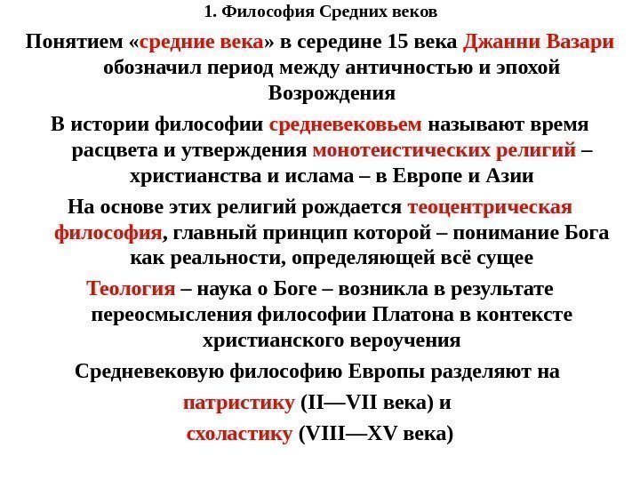 1. Философия Средних веков Понятием « средние века » в середине 15 века Джанни Вазари обозначил период между античностью и эпохой Возрождения В истории философии средневековьем называют время расцвета и утверждения монотеистических религий – христианства и ислама – в Европе и Азии На основе этих религий рождается теоцентрическая философия , главный принцип которой – понимание Бога как реальности, определяющей всё сущее Теология – наука о Боге – возникла в результате переосмысления философии Платона в контексте христианского вероучения Средневековую философию Европы разделяют на патристику (II—VII века) и схоластику (VIII—XV века)