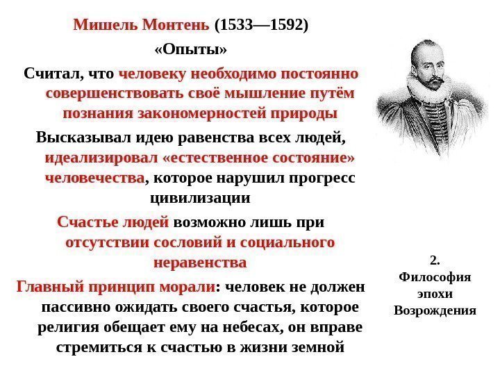 2. Философия эпохи Возрождения. Мишель Монтень (1533— 1592) «Опыты» Считал, что человеку необходимо постоянно совершенствовать своё мышление путём познания закономерностей природы Высказывал идею равенства всех людей, идеализировал «естественное состояние» человечества , которое нарушил прогресс цивилизации Счастье людей возможно лишь при отсутствии сословий и социального неравенства Главный принцип морали : человек не должен пассивно ожидать своего счастья, которое религия обещает ему на небесах, он вправе стремиться к счастью в жизни земной