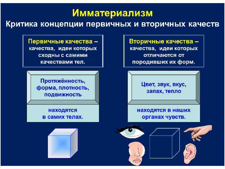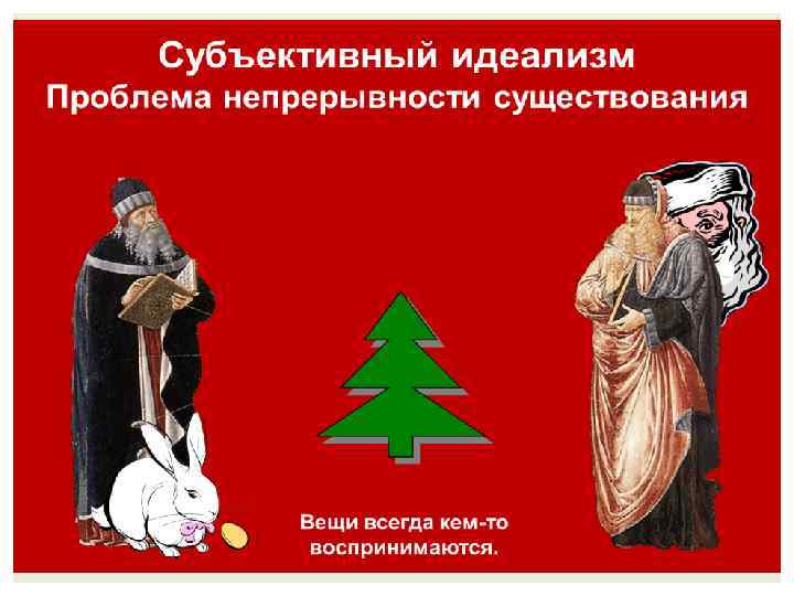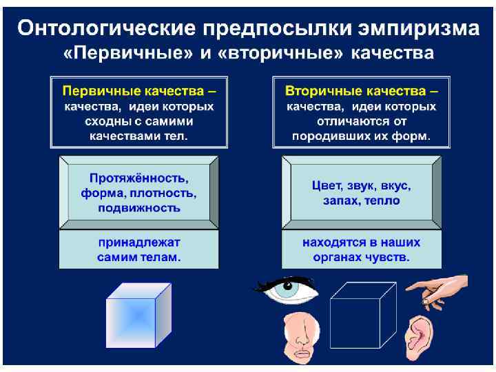 ОСНОВНЫЕ РАЗНОВИДНОСТИ ИДОЛОВ ПЛОЩАДИ: § Поверхностный и искусственный характер различий, устанавливаемых обыденным словоупотреблением (неудачные имена для существующих вещей): § словесное отождествление вещей, в основах своих различных (например, «земля» как одна из «четырёх субстанций» ); § словесное различение вещей, в основе своей идентичных (например, лёд, вода, пар). § Возможность изобретения и употребления имён несуществующих вещей (например, «судьба» , «перводвигатель» и т. п. ), вследствие чего разум втягивается в беспредметные, бессмысленные и бесплодные споры.