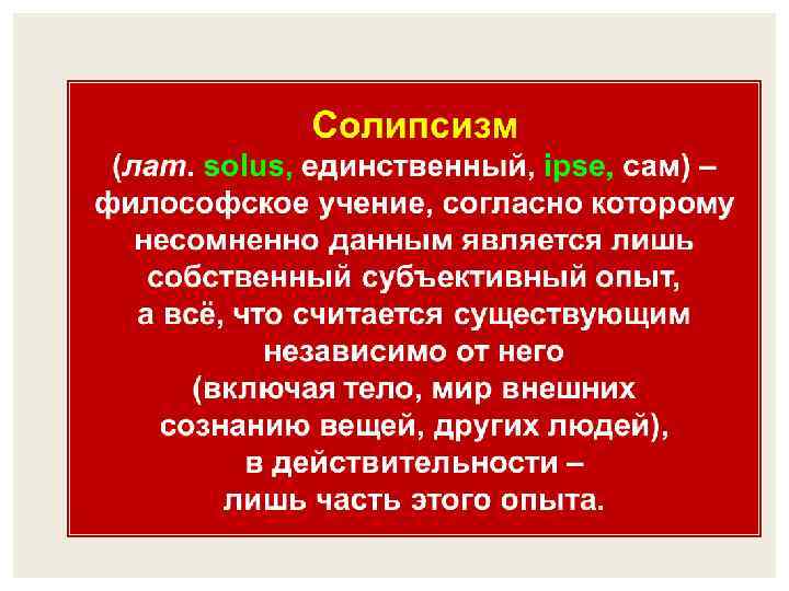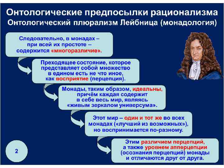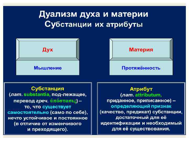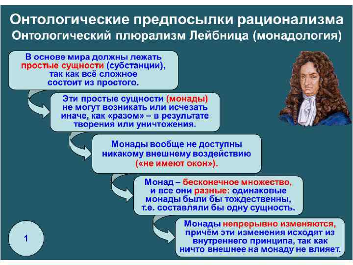 Монизм (от греч. μόνος, один, единственный) – онтологическая позиция, признающая единство мира, т. е. принципиальную сводимость всех его объектов (явлений) к единой субстанциальной основе. Плюрализм (от лат. pluralis, множественный) – онтологическая позиция, признающая наличие в мире множества принципиально независимых (несводимых друг к другу) первоначал (субстанций). Дуализм (от лат. dualis, двойственный) – разновидность плюрализма, ограничивающая число независимых первосущностей мира двумя (обычно такими первоначалами признаются материальное и духовное).