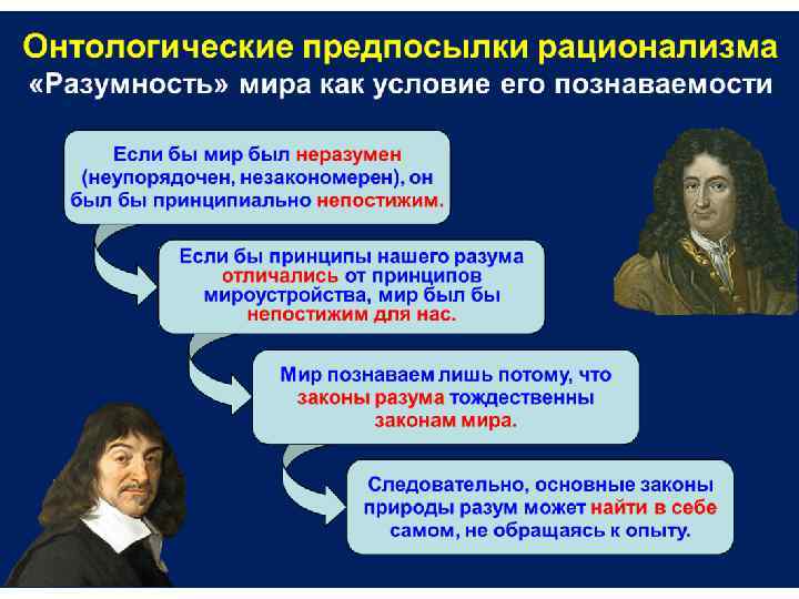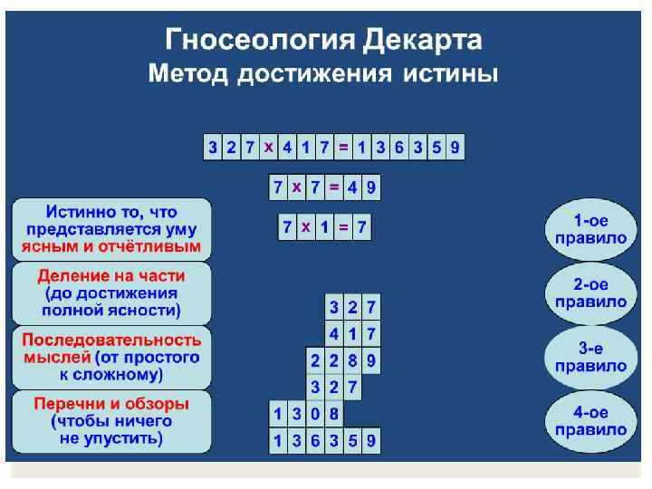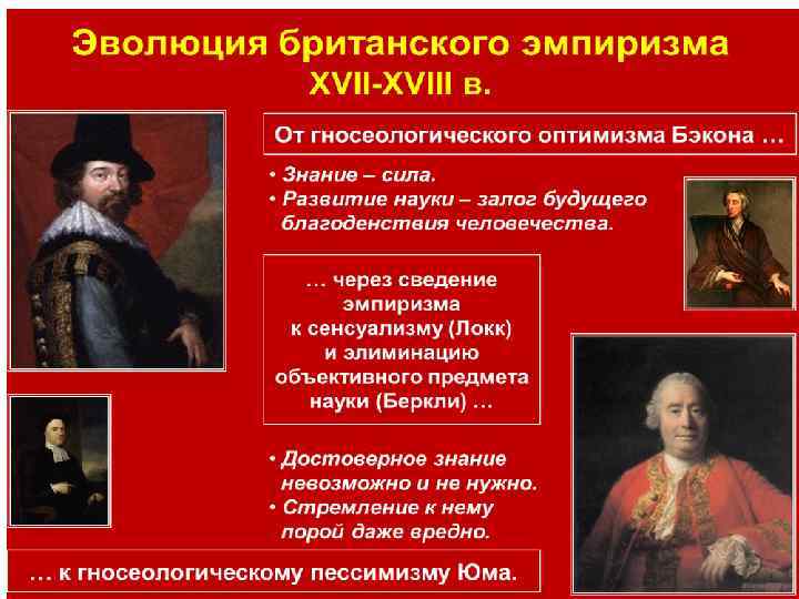 ФОРМЫ РАЗВИТИЯ ФИЛОСОФСКОЙ МЫСЛИ В 17 ВЕКЕ Эмпиризм (сенсуализм) Рационализм Ф. Бэкон Т. Гоббс Дж. Локк - Основу нового метода ищут в чувственном опыте, выдвигая идею сверхзначимости эмпирического индуктивного знания Р. Декарт Г. Лейбниц Б. Спиноза - Основу нового метода ищут в интеллекте, дающем логическое дедуктивноматематическое знание, не сводящееся к опыту