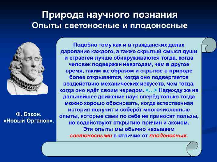 Высшая задача познания – завоевание природы и усовершенствование человеческой жизни. Два вида опытов - «плодоносные» – принесение непосредственной пользы человеку - «светоносные» – познание законов, явлений и свойств вещей