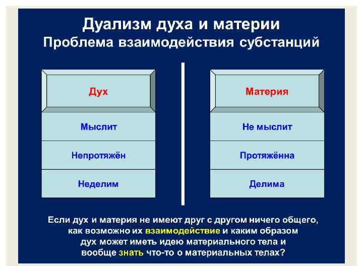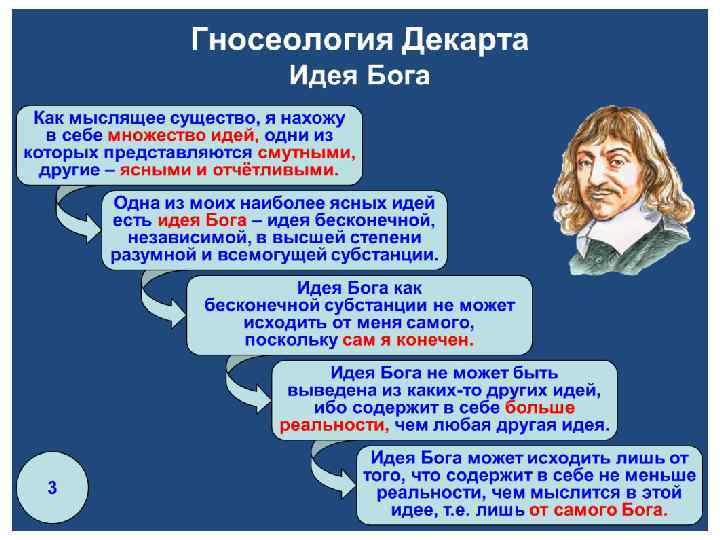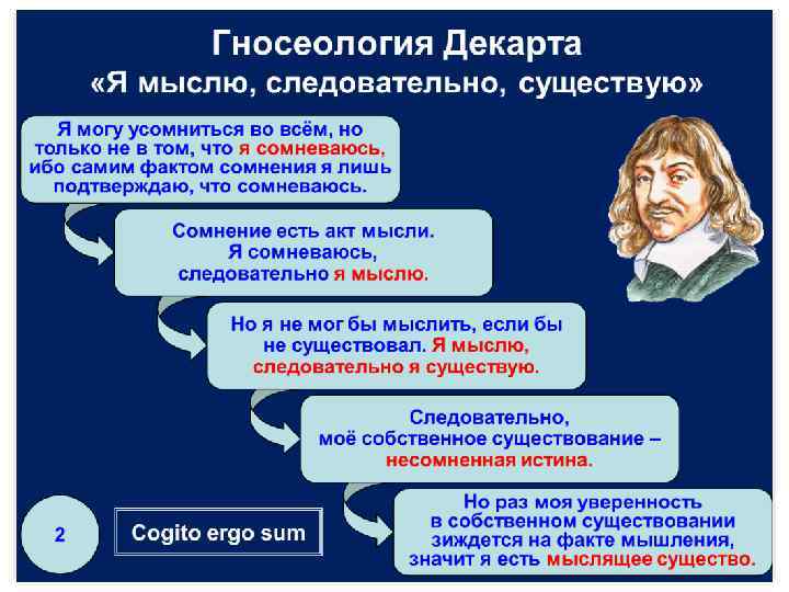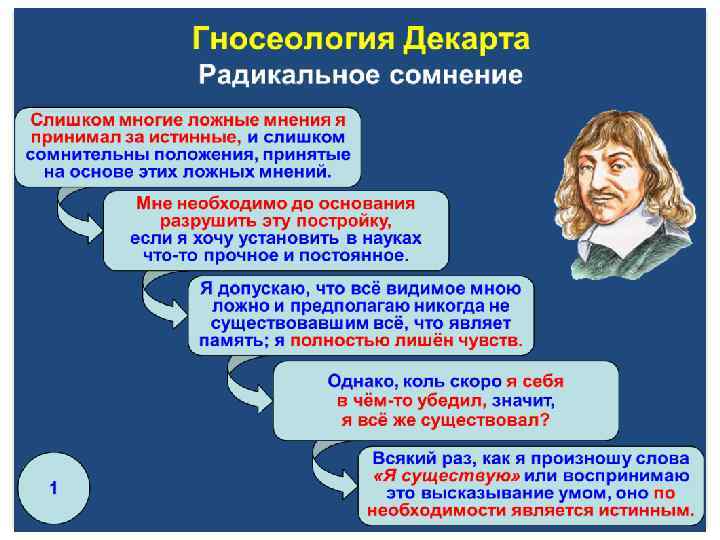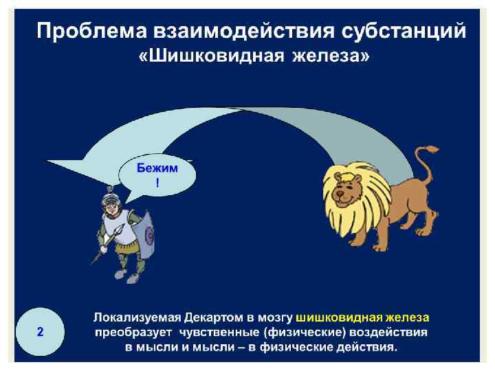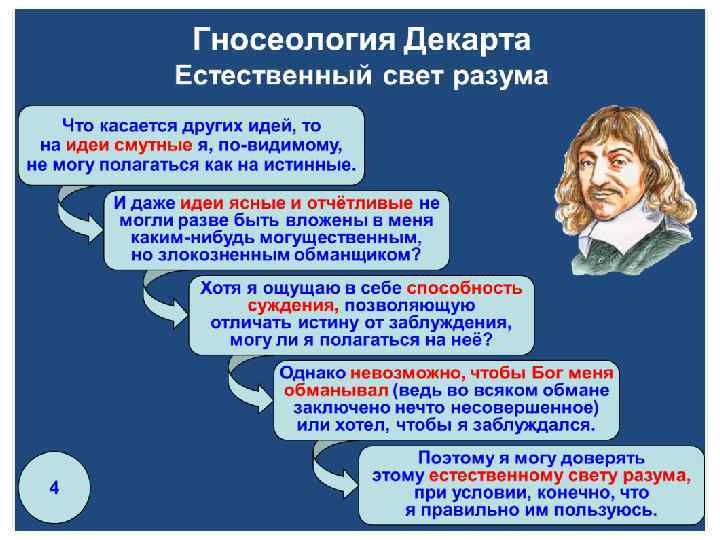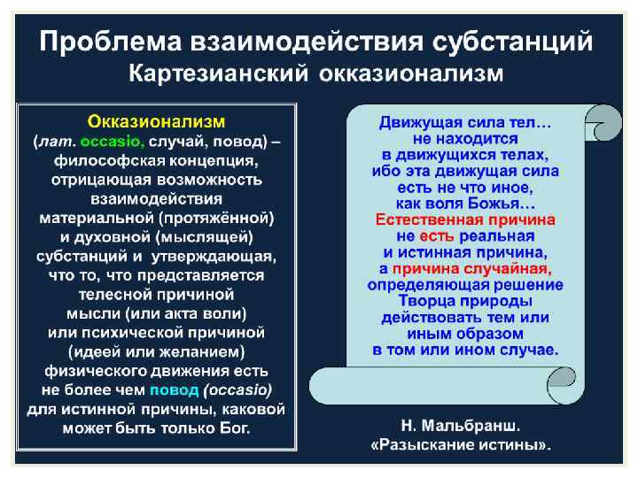 РЕНЕ ДЕКАРТ ДУАЛИСТИЧЕСКИЙ РАЦИОНАЛИЗМ Гносеология Декарта Радикальное сомнение «Я мыслю, следовательно, существую» Идея Бога Естественный свет разума Метод достижения истины Онтология Декарта Дуализм духа и материи Субстанции и их атрибуты Отрицание пустого пространства и психики животных Проблема взаимодействия субстанций Естественный свет разума ( «врождённые идеи» ) «Шишковидная железа» Психофизический параллелизм Проблема взаимодействия субстанций в картезианстве: окказионализм А. Гейлинкса и Н. Мальбранша