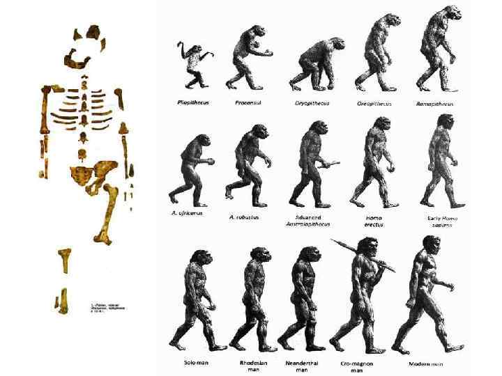 Эволюционизм представляет формирование человека под влиянием ряда факторов: ØКлиматических (ледниковые периоды) ØГеомагнитных (изменения магнитного поля Земли, радиоактивного фона и т. п. ) ØБиологических (изменения фенотипа, физиологии и т. п. ) Основные факторы – «гоминидная триада» • Прямохождение; • Развитие кисти руки; • Развитие коры больших полушарий головного мозга. Антропологические признаки: бипедальность, строение скелета (черепа, таза), гортани, зубов и т. п. Основными факторами эволюции признаются также параллельное развитие трудовых навыков и общения.