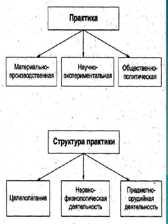 Практика u— это чувственная, предметная, материальная деятельность людей, посредством которой они целенаправленно преобразуют окружающий природный и социальный мир.