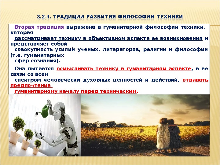 Вторая традиция выражена в гуманитарной философии техники , которая рассматривает технику в объективном аспекте ее возникновения и представляет собой совокупность усилий ученых, литераторов, религии и философии (т. е. гуманитарных сфер сознания). Она пытается осмысливать технику в гуманитарном аспекте , в ее связи со всем спектром человечески духовных ценностей и действий, отдавать предпочтение гуманитарному началу перед техническим. Эта традиция зарождается уже в романтическом движении, в «Рассуждении о науках и искусстве » Жан Жака Руссо , находит свое продолжение в философии экзистенциализма и близких к ним философов – А. Бергсона, К. Ясперса, Г. Марселя, Г. Маркузе.