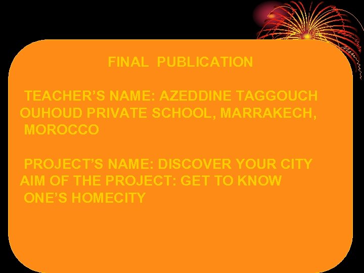 FINAL PUBLICATION TEACHER’S NAME: AZEDDINE TAGGOUCH OUHOUD PRIVATE SCHOOL, MARRAKECH, MOROCCO PROJECT’S NAME: DISCOVER YOUR CITY AIM OF THE PROJECT: GET TO KNOW ONE’S HOMECITY