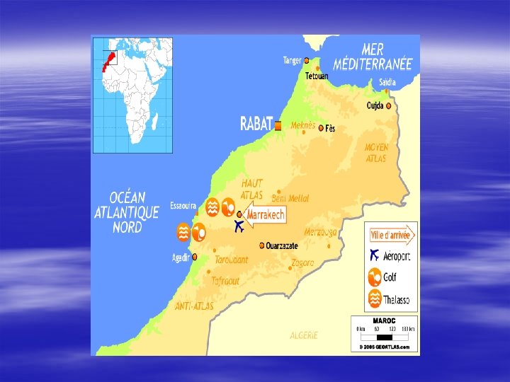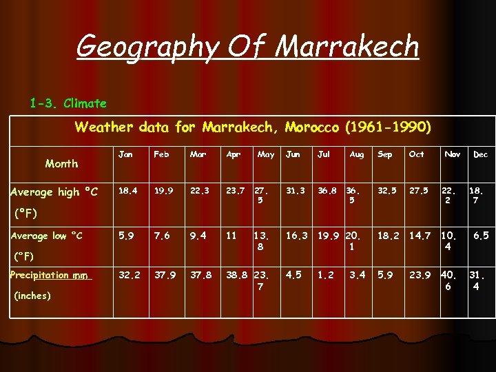 Geography Of Marrakech 1 -3. Climate Weather data for Marrakech, Morocco (1961 -1990) Month Average high °C Jan Feb Mar Apr 18. 4 19. 9 22. 3 23. 7 5. 9 7. 6 9. 4 11 32. 2 37. 9 37. 8 38. 8 23. 7 (°F) Average low °C (°F) Precipitation mm (inches) May Jun Jul 27. 5 31. 3 36. 8 13. 8 Sep Oct 32. 5 27. 5 16. 3 19. 9 20. 1 18. 2 14. 7 10. 4 4. 5 5. 9 23. 9 40. 6 1. 2 Aug 36. 5 3. 4 Nov 22. 2 Dec 18. 7 6. 5 31. 4