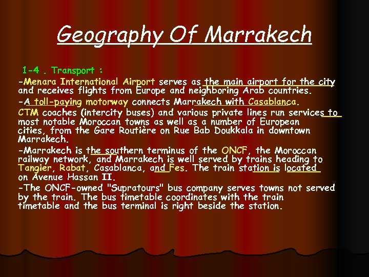Geography Of Marrakech 1 -4. Transport : -Menara International Airport serves as the main airport for the city and receives flights from Europe and neighboring Arab countries. -A toll-paying motorway connects Marrakech with Casablanca. CTM coaches (intercity buses) and various private lines run services to most notable Moroccan towns as well as a number of European cities, from the Gare Routière on Rue Bab Doukkala in downtown Marrakech. -Marrakech is the southern terminus of the ONCF, the Moroccan railway network, and Marrakech is well served by trains heading to Tangier, Rabat, Casablanca, and Fes. The train station is located on Avenue Hassan II. -The ONCF-owned "Supratours" bus company serves towns not served by the train. The bus timetable coordinates with the train timetable and the bus terminal is right beside the station.