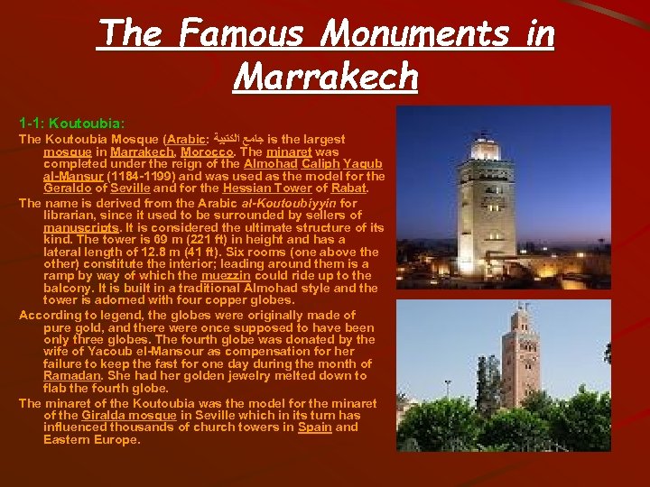 The Famous Monuments in Marrakech 1 -1: Koutoubia: The Koutoubia Mosque (Arabic: ﺟﺎﻣﻊ ﺍﻟﻜﺘﺒﻴﺔ is the largest mosque in Marrakech, Morocco. The minaret was completed under the reign of the Almohad Caliph Yaqub al-Mansur (1184 -1199) and was used as the model for the Geraldo of Seville and for the Hessian Tower of Rabat. The name is derived from the Arabic al-Koutoubiyyin for librarian, since it used to be surrounded by sellers of manuscripts. It is considered the ultimate structure of its kind. The tower is 69 m (221 ft) in height and has a lateral length of 12. 8 m (41 ft). Six rooms (one above the other) constitute the interior; leading around them is a ramp by way of which the muezzin could ride up to the balcony. It is built in a traditional Almohad style and the tower is adorned with four copper globes. According to legend, the globes were originally made of pure gold, and there were once supposed to have been only three globes. The fourth globe was donated by the wife of Yacoub el-Mansour as compensation for her failure to keep the fast for one day during the month of Ramadan. She had her golden jewelry melted down to flab the fourth globe. The minaret of the Koutoubia was the model for the minaret of the Giralda mosque in Seville which in its turn has influenced thousands of church towers in Spain and Eastern Europe.