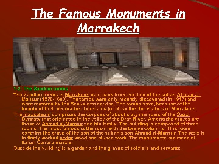 The Famous Monuments in Marrakech 1 -2: The Saadian tombs : The Saadian tombs in Marrakech date back from the time of the sultan Ahmad al. Mansur (1578 -1603). The tombs were only recently discovered (in 1917) and were restored by the Beaux-arts service. The tombs have, because of the beauty of their decoration, been a major attraction for visitors of Marrakech. The mausoleum comprises the corpses of about sixty members of the Saadi Dynasty that originated in the valley of the Draa River. Among the graves are those of Ahmad al-Mansur and his family. The building is composed of three rooms. The most famous is the room with the twelve columns. This room contains the grave of the son of the sultan's son Ahmad al-Mansur. The stele is in finely worked cedar wood and stucco work. The monuments are made of Italian Carrara marble. Outside the building is a garden and the graves of soldiers and servants.