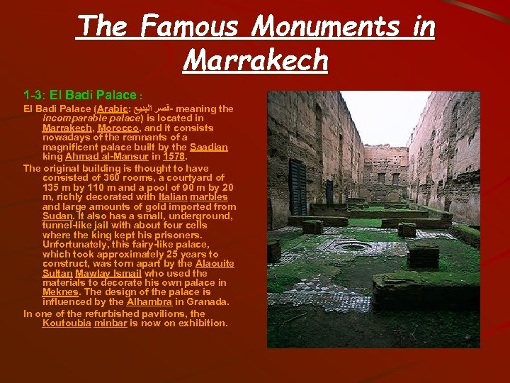 The Famous Monuments in Marrakech 1 -3: El Badi Palace (Arabic: -ﻗﺼﺮ ﺍﻟﺒﺪﻳﻊ meaning the incomparable palace) is located in Marrakech, Morocco, and it consists nowadays of the remnants of a magnificent palace built by the Saadian king Ahmad al-Mansur in 1578. The original building is thought to have consisted of 360 rooms, a courtyard of 135 m by 110 m and a pool of 90 m by 20 m, richly decorated with Italian marbles and large amounts of gold imported from Sudan. It also has a small, underground, tunnel-like jail with about four cells where the king kept his prisoners. Unfortunately, this fairy-like palace, which took approximately 25 years to construct, was torn apart by the Alaouite Sultan Mawlay Ismail who used the materials to decorate his own palace in Meknes. The design of the palace is influenced by the Alhambra in Granada. In one of the refurbished pavilions, the Koutoubia minbar is now on exhibition.