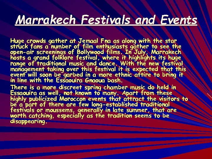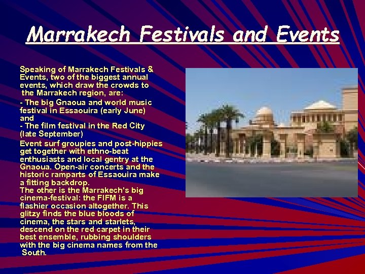 Marrakech Festivals and Events Speaking of Marrakech Festivals & Events, two of the biggest annual events, which draw the crowds to the Marrakech region, are: - The big Gnaoua and world music festival in Essaouira (early June) and - The film festival in the Red City (late September) Event surf groupies and post-hippies get together with ethno-beat enthusiasts and local gentry at the Gnaoua. Open-air concerts and the historic ramparts of Essaouira make a fitting backdrop. The other is the Marrakech's big cinema-festival: the FIFM is a flashier occasion altogether. This glitzy finds the blue bloods of cinema, the stars and starlets, descend on the red carpet in their best ensemble, rubbing shoulders with the big cinema names from the South.