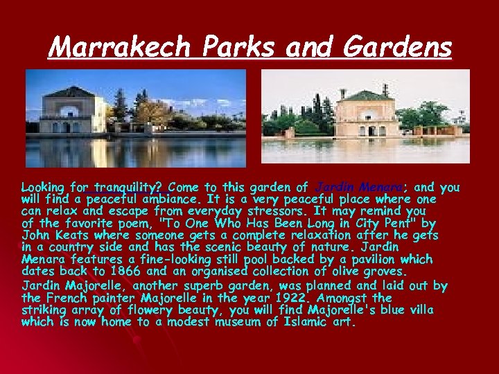 Marrakech Parks and Gardens Looking for tranquility? Come to this garden of Jardin Menara; and you will find a peaceful ambiance. It is a very peaceful place where one can relax and escape from everyday stressors. It may remind you of the favorite poem, "To One Who Has Been Long in City Pent" by John Keats where someone gets a complete relaxation after he gets in a country side and has the scenic beauty of nature. Jardin Menara features a fine-looking still pool backed by a pavilion which dates back to 1866 and an organised collection of olive groves. Jardin Majorelle, another superb garden, was planned and laid out by the French painter Majorelle in the year 1922. Amongst the striking array of flowery beauty, you will find Majorelle's blue villa which is now home to a modest museum of Islamic art.