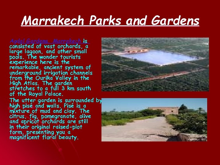 Marrakech Parks and Gardens Agdal Gardens, Marrakech is consisted of vast orchards, a large lagoon, and other small pools. The wonder tourists experience here is the remarkable, ancient system of underground irrigation channels from the Ourika Valley in the High Atlas. The garden stretches to a full 3 km south of the Royal Palace. The utter garden is surrounded by high pisé and walls. Pisé is a mixture of mud and clay. The citrus, fig, pomegranate, olive and apricot orchards are still in their original raised-plot form, presenting you a magnificent floral beauty.