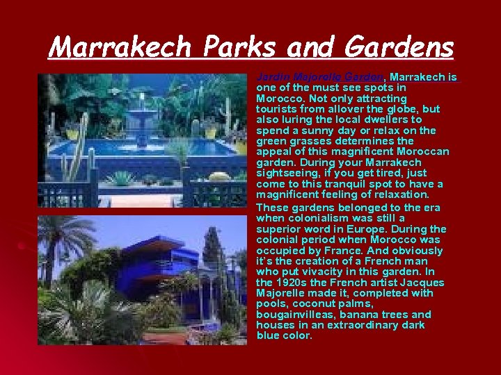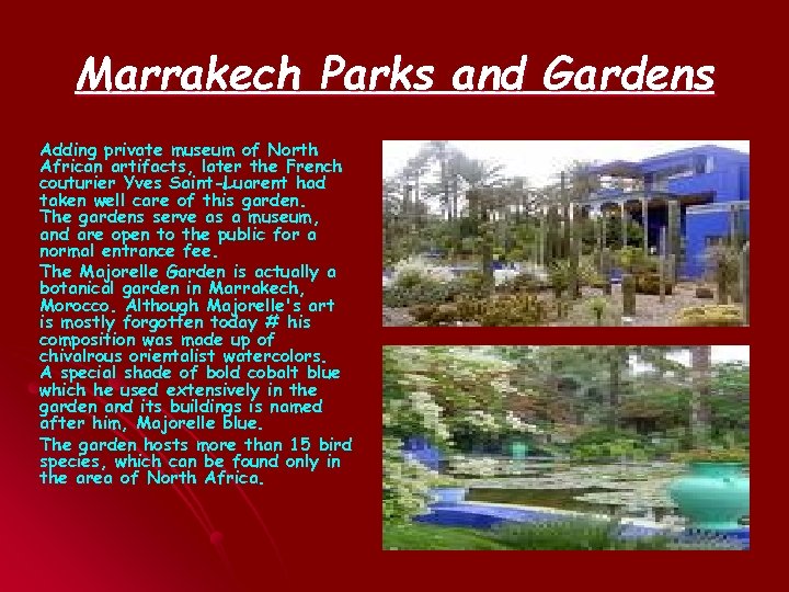 Marrakech Parks and Gardens Adding private museum of North African artifacts, later the French couturier Yves Saint-Luarent had taken well care of this garden. The gardens serve as a museum, and are open to the public for a normal entrance fee. The Majorelle Garden is actually a botanical garden in Marrakech, Morocco. Although Majorelle's art is mostly forgotten today # his composition was made up of chivalrous orientalist watercolors. A special shade of bold cobalt blue which he used extensively in the garden and its buildings is named after him, Majorelle blue. The garden hosts more than 15 bird species, which can be found only in the area of North Africa.