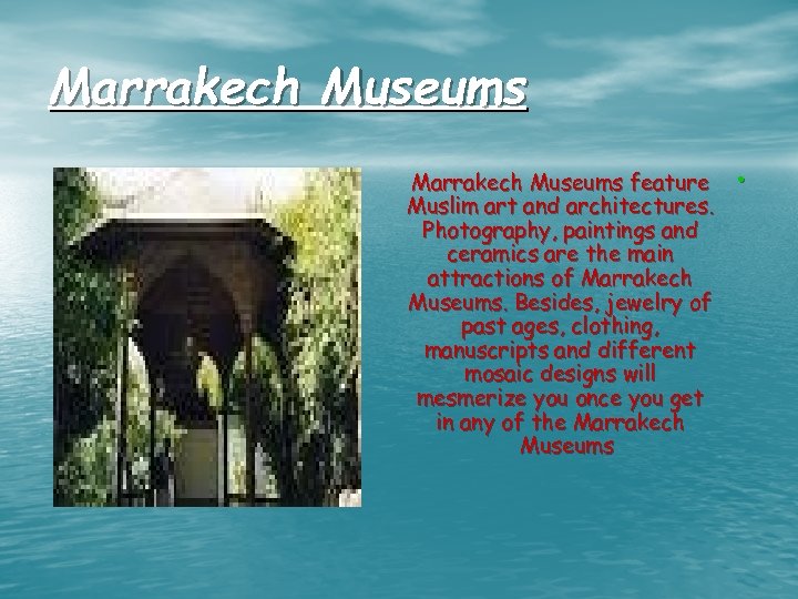 Marrakech Museums feature Muslim art and architectures. Photography, paintings and ceramics are the main attractions of Marrakech Museums. Besides, jewelry of past ages, clothing, manuscripts and different mosaic designs will mesmerize you once you get in any of the Marrakech Museums •