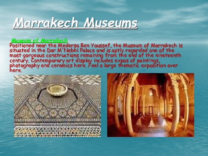 Marrakech Museums Museum of Marrakech Positioned near the Medersa Ben Youssef, the Museum of Marrakech is situated in the Dar M'Nebhi Palace and is aptly regarded one of the most gorgeous constructions remaining from the end of the nineteenth century. Contemporary art display includes expos of paintings, photography and ceramics here. Feel a large thematic exposition over here.