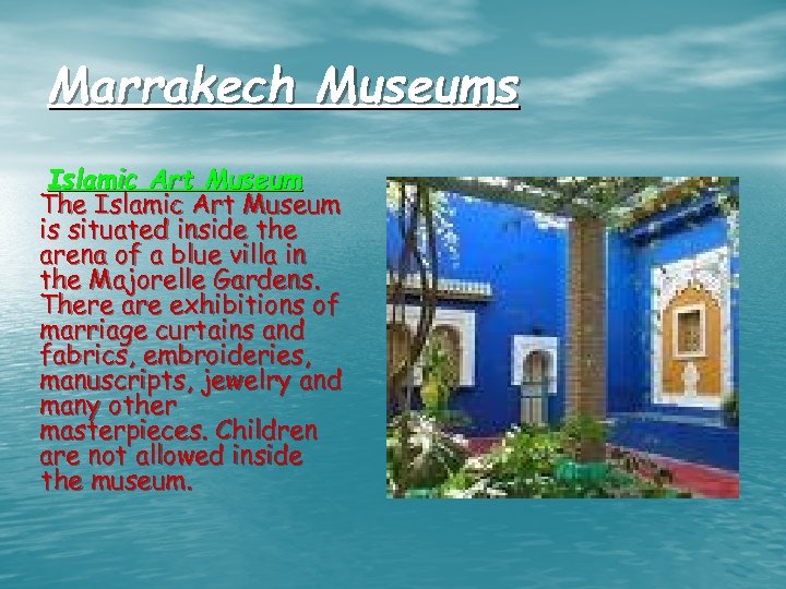 Marrakech Museums Islamic Art Museum The Islamic Art Museum is situated inside the arena of a blue villa in the Majorelle Gardens. There are exhibitions of marriage curtains and fabrics, embroideries, manuscripts, jewelry and many other masterpieces. Children are not allowed inside the museum.