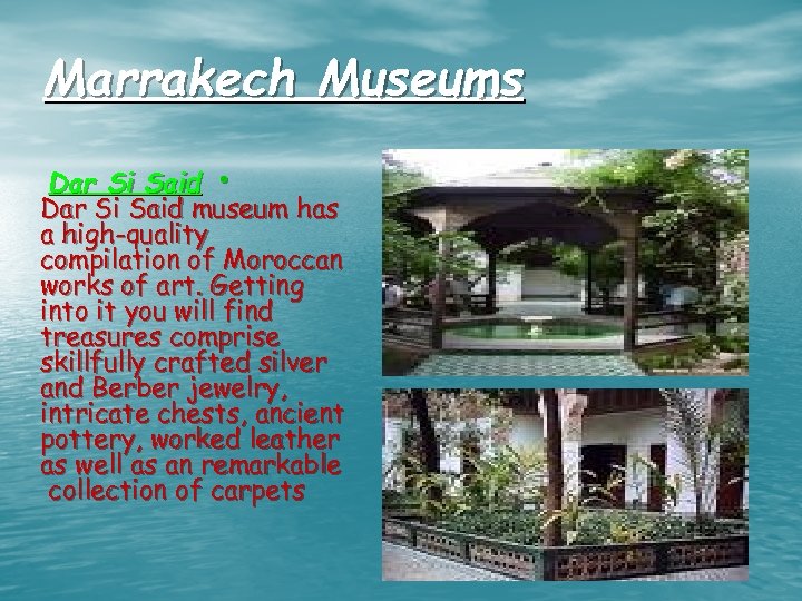 Marrakech Museums Dar Si Said • Dar Si Said museum has a high-quality compilation of Moroccan works of art. Getting into it you will find treasures comprise skillfully crafted silver and Berber jewelry, intricate chests, ancient pottery, worked leather as well as an remarkable collection of carpets