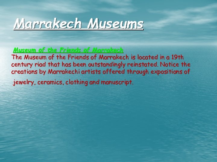 Marrakech Museums Museum of the Friends of Marrakech The Museum of the Friends of Marrakech is located in a 19 th century riad that has been outstandingly reinstated. Notice the creations by Marrakechi artists offered through expositions of jewelry, ceramics, clothing and manuscript.