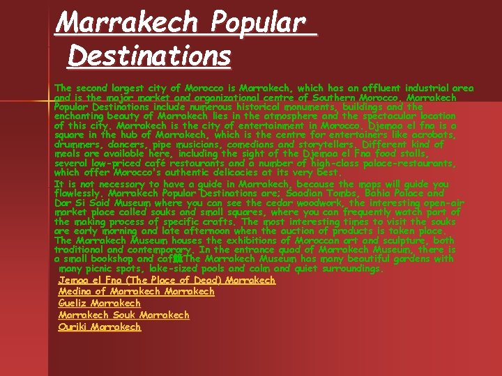 Marrakech Popular Destinations The second largest city of Morocco is Marrakech, which has an affluent industrial area and is the major market and organizational centre of Southern Morocco. Marrakech Popular Destinations include numerous historical monuments, buildings and the enchanting beauty of Marrakech lies in the atmosphere and the spectacular location of this city. Marrakech is the city of entertainment in Morocco. Djemaa el fna is a square in the hub of Marrakech, which is the centre for entertainers like acrobats, drummers, dancers, pipe musicians, comedians and storytellers. Different kind of meals are available here, including the sight of the Djemaa el Fna food stalls, several low-priced café restaurants and a number of high-class palace-restaurants, which offer Morocco's authentic delicacies at its very best. It is not necessary to have a guide in Marrakech, because the maps will guide you flawlessly. Marrakech Popular Destinations are; Saadian Tombs, Bahia Palace and Dar Si Said Museum where you can see the cedar woodwork, the interesting open-air market place called souks and small squares, where you can frequently watch part of the making process of specific crafts. The most interesting times to visit the souks are early morning and late afternoon when the auction of products is taken place. The Marrakech Museum houses the exhibitions of Moroccan art and sculpture, both traditional and contemporary. In the entrance quad of Marrakech Museum, there is a small bookshop and caf鮠The Marrakech Museum has many beautiful gardens with many picnic spots, lake-sized pools and calm and quiet surroundings. Jemaa el Fna (The Place of Dead) Marrakech Medina of Marrakech Gueliz Marrakech Souk Marrakech Ouriki Marrakech