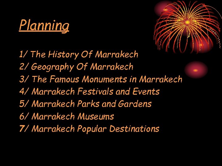 Planning 1/ The History Of Marrakech 2/ Geography Of Marrakech 3/ The Famous Monuments in Marrakech 4/ Marrakech Festivals and Events 5/ Marrakech Parks and Gardens 6/ Marrakech Museums 7/ Marrakech Popular Destinations