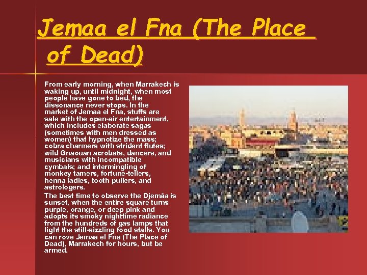 Jemaa el Fna (The Place of Dead) At the center of Medina, the famous Djemâa el Fna square is situated, which is the heartbeat of Marrakech. The name of Jemaa el Fna (The Place of Dead), Marrakech has many interpretations: as Djemâa means, "meeting place" and el Fna means "the end" or "death, " it could be translated as "Mosque of Death" or "Meeting Place at the End of the World. " Nowadays Jemaa el Fna is a tourist spot, but in the past, the Djemâa's purpose was horrific: it was the place for public viewings of the disengaged heads of sinners, criminals, and Christians, hung on stakes around the square. Presently, the Jemaa el Fna (The Place of Dead), Marrakech is a place of the endless, seething carnival, which covers every activity of man. It is a gathering place of local farmers and tradesmen. Jemaa el Fna is a wide area bordered with small mosques and a series of cafés, all with rooftop terraces that permit a panoramic bird's-eye view.