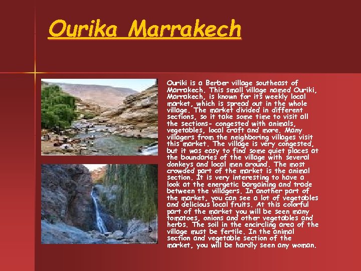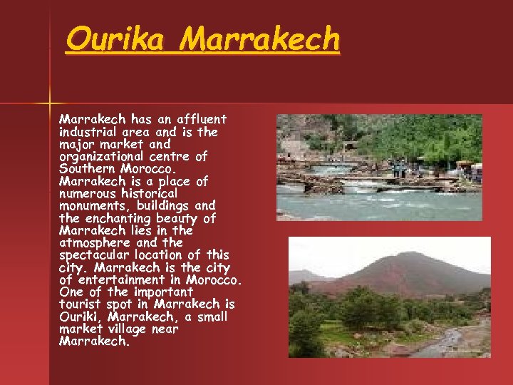 Ourika Marrakech has an affluent industrial area and is the major market and organizational centre of Southern Morocco. Marrakech is a place of numerous historical monuments, buildings and the enchanting beauty of Marrakech lies in the atmosphere and the spectacular location of this city. Marrakech is the city of entertainment in Morocco. One of the important tourist spot in Marrakech is Ouriki, Marrakech, a small market village near Marrakech.