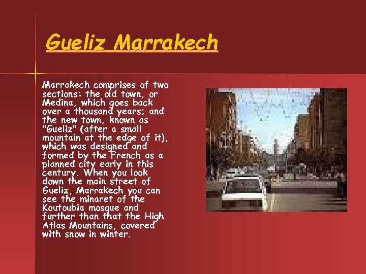 Gueliz Marrakech comprises of two sections: the old town, or Medina, which goes back over a thousand years; and the new town, known as "Gueliz" (after a small mountain at the edge of it), which was designed and formed by the French as a planned city early in this century. When you look down the main street of Gueliz, Marrakech you can see the minaret of the Koutoubia mosque and further than that the High Atlas Mountains, covered with snow in winter.