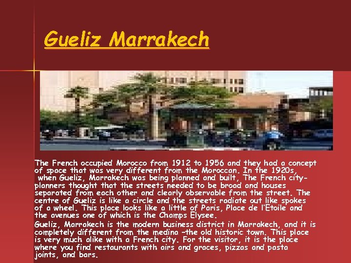 Gueliz Marrakech The French occupied Morocco from 1912 to 1956 and they had a concept of space that was very different from the Moroccan. In the 1920 s, when Gueliz, Marrakech was being planned and built, The French cityplanners thought that the streets needed to be broad and houses separated from each other and clearly observable from the street. The centre of Gueliz is like a circle and the streets radiate out like spokes of a wheel. This place looks like a little of Paris, Place de l’Etoile and the avenues one of which is the Champs Elysee. Gueliz, Marrakech is the modern business district in Marrakech, and it is completely different from the medina –the old historic town. This place is very much alike with a French city. For the visitor, it is the place where you find restaurants with airs and graces, pizzas and pasta joints, and bars.