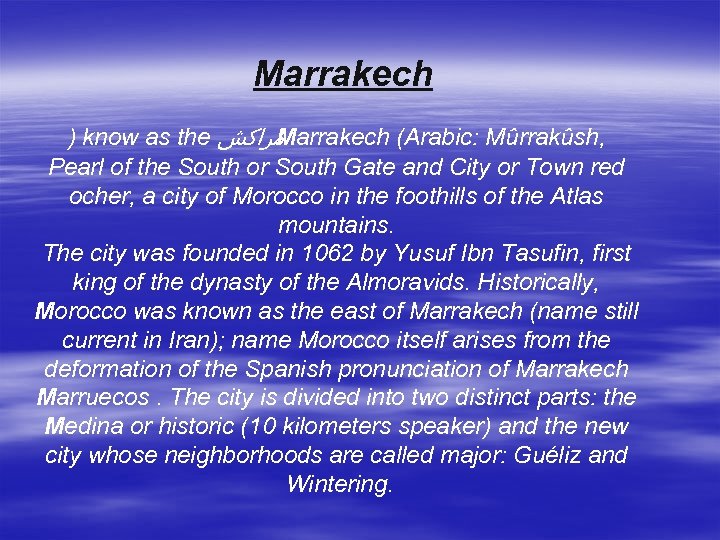 Marrakech ) know as the ﻣﺮﺍﻛﺶ arrakech (Arabic: Mûrrakûsh, M Pearl of the South or South Gate and City or Town red ocher, a city of Morocco in the foothills of the Atlas mountains. The city was founded in 1062 by Yusuf Ibn Tasufin, first king of the dynasty of the Almoravids. Historically, Morocco was known as the east of Marrakech (name still current in Iran); name Morocco itself arises from the deformation of the Spanish pronunciation of Marrakech Marruecos. The city is divided into two distinct parts: the Medina or historic (10 kilometers speaker) and the new city whose neighborhoods are called major: Guéliz and Wintering.