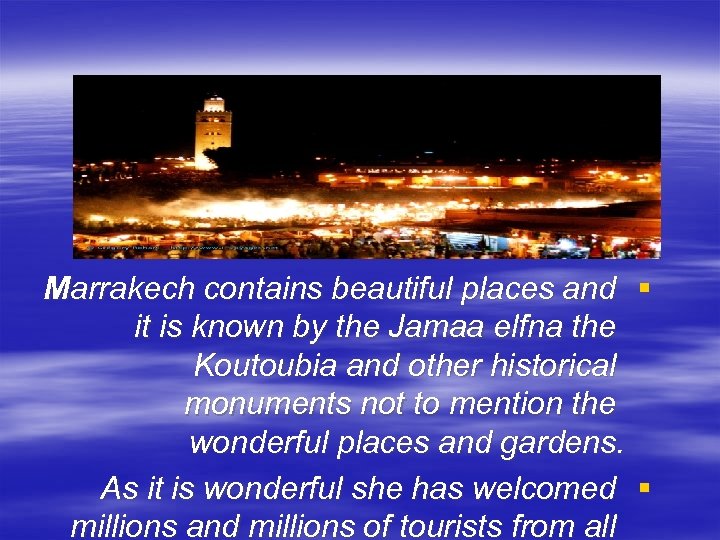 Marrakech contains beautiful places and it is known by the Jamaa elfna the Koutoubia and other historical monuments not to mention the wonderful places and gardens. As it is wonderful she has welcomed millions and millions of tourists from all § §
