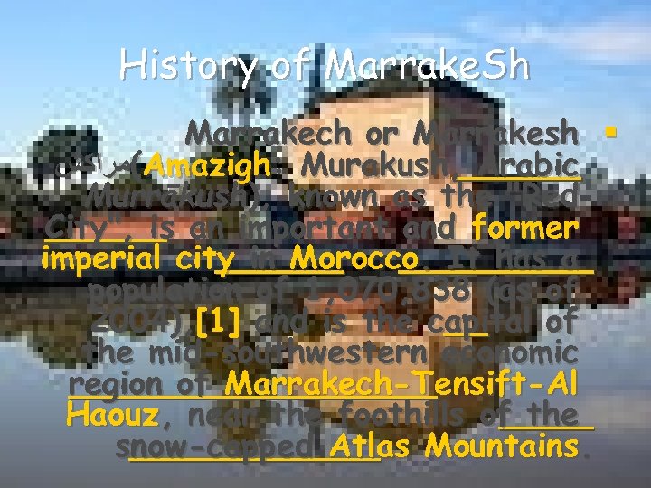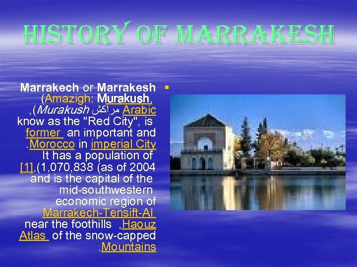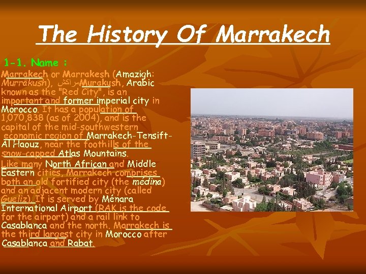 The History Of Marrakech 1 -1. Name : Marrakech or Marrakesh (Amazigh: Murrākush), ﻣﺮﺍﻛﺶ Murakush, Arabic known as the "Red City", is an important and former imperial city in Morocco. It has a population of 1, 070, 838 (as of 2004), and is the capital of the mid-southwestern economic region of Marrakech-Tensift. Al Haouz, near the foothills of the snow-capped Atlas Mountains. Like many North African and Middle Eastern cities, Marrakech comprises both an old fortified city (the médina) and an adjacent modern city (called Gueliz). It is served by Ménara International Airport (RAK is the code for the airport) and a rail link to Casablanca and the north. Marrakech is the third largest city in Morocco after Casablanca and Rabat.