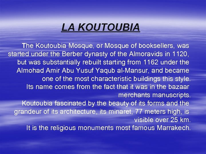LA KOUTOUBIA The Koutoubia Mosque, or Mosque of booksellers, was started under the Berber dynasty of the Almoravids in 1120, but was substantially rebuilt starting from 1162 under the Almohad Amir Abu Yusuf Yaqub al-Mansur, and became one of the most characteristic buildings this style. Its name comes from the fact that it was in the bazaar merchants manuscripts. Koutoubia fascinated by the beauty of its forms and the grandeur of its architecture, its minaret, 77 meters high, is visible over 25 km. It is the religious monuments most famous Marrakech.
