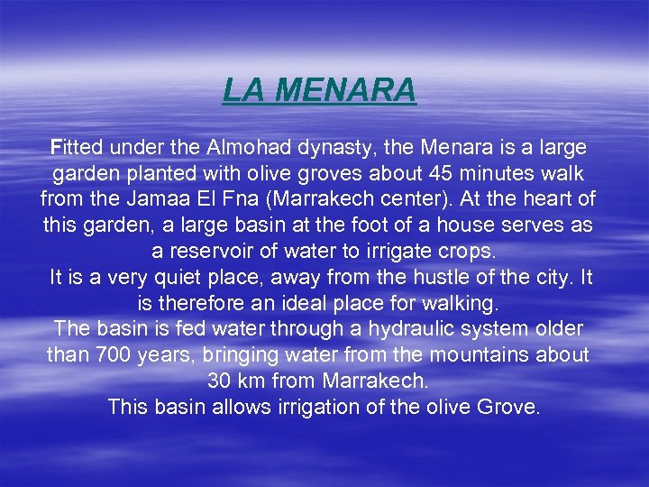 LA MENARA Fitted under the Almohad dynasty, the Menara is a large garden planted with olive groves about 45 minutes walk from the Jamaa El Fna (Marrakech center). At the heart of this garden, a large basin at the foot of a house serves as a reservoir of water to irrigate crops. It is a very quiet place, away from the hustle of the city. It is therefore an ideal place for walking. The basin is fed water through a hydraulic system older than 700 years, bringing water from the mountains about 30 km from Marrakech. This basin allows irrigation of the olive Grove.
