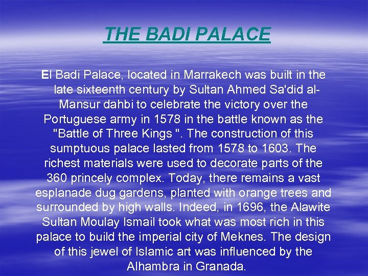 THE BADI PALACE El Badi Palace, located in Marrakech was built in the late sixteenth century by Sultan Ahmed Sa'did al. Mansur dahbi to celebrate the victory over the Portuguese army in 1578 in the battle known as the "Battle of Three Kings ". The construction of this sumptuous palace lasted from 1578 to 1603. The richest materials were used to decorate parts of the 360 princely complex. Today, there remains a vast esplanade dug gardens, planted with orange trees and surrounded by high walls. Indeed, in 1696, the Alawite Sultan Moulay Ismail took what was most rich in this palace to build the imperial city of Meknes. The design of this jewel of Islamic art was influenced by the Alhambra in Granada.