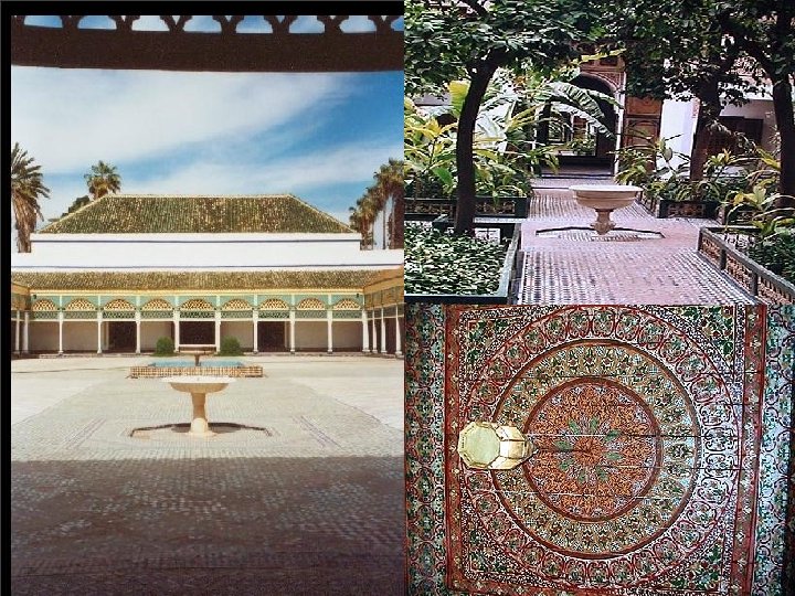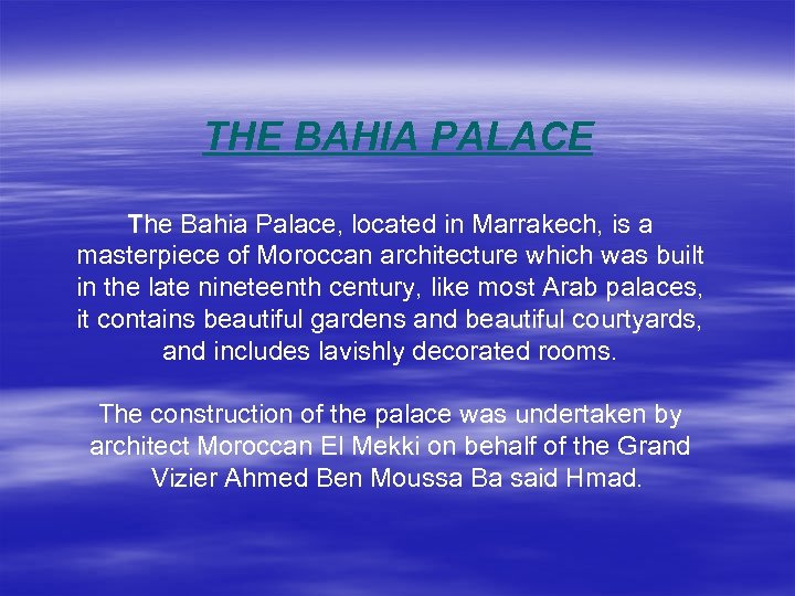 THE BAHIA PALACE The Bahia Palace, located in Marrakech, is a masterpiece of Moroccan architecture which was built in the late nineteenth century, like most Arab palaces, it contains beautiful gardens and beautiful courtyards, and includes lavishly decorated rooms. The construction of the palace was undertaken by architect Moroccan El Mekki on behalf of the Grand Vizier Ahmed Ben Moussa Ba said Hmad.