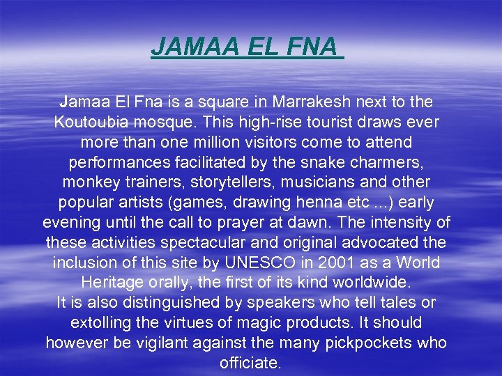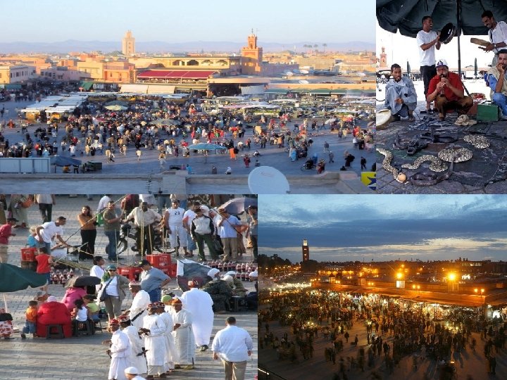 JAMAA EL FNA Jamaa El Fna is a square in Marrakesh next to the Koutoubia mosque. This high-rise tourist draws ever more than one million visitors come to attend performances facilitated by the snake charmers, monkey trainers, storytellers, musicians and other popular artists (games, drawing henna etc. . . ) early evening until the call to prayer at dawn. The intensity of these activities spectacular and original advocated the inclusion of this site by UNESCO in 2001 as a World Heritage orally, the first of its kind worldwide. It is also distinguished by speakers who tell tales or extolling the virtues of magic products. It should however be vigilant against the many pickpockets who officiate.