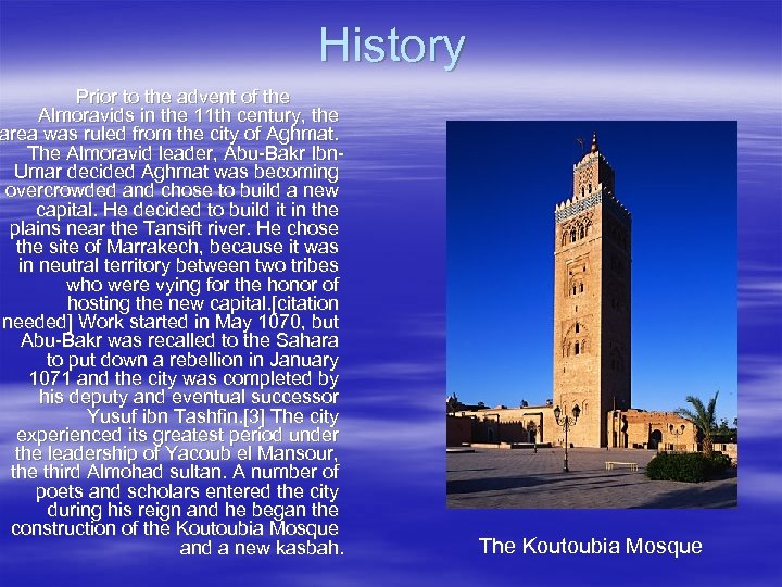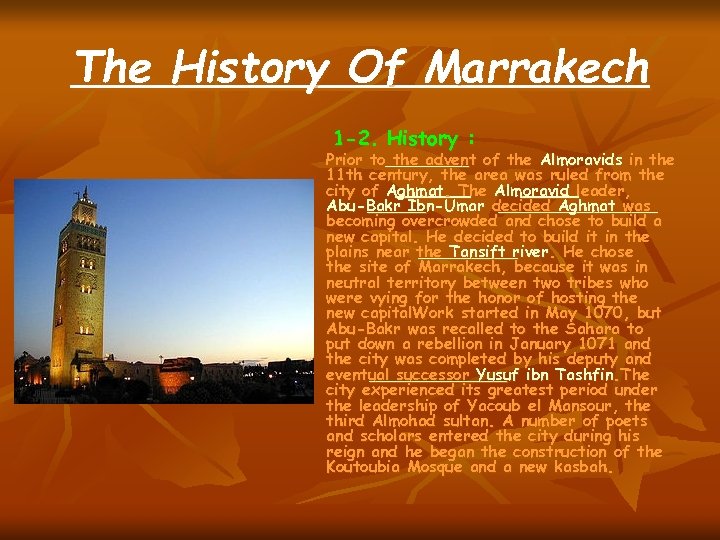 The History Of Marrakech 1 -2. History : Prior to the advent of the Almoravids in the 11 th century, the area was ruled from the city of Aghmat. The Almoravid leader, Abu-Bakr Ibn-Umar decided Aghmat was becoming overcrowded and chose to build a new capital. He decided to build it in the plains near the Tansift river. He chose the site of Marrakech, because it was in neutral territory between two tribes who were vying for the honor of hosting the new capital. Work started in May 1070, but Abu-Bakr was recalled to the Sahara to put down a rebellion in January 1071 and the city was completed by his deputy and eventual successor Yusuf ibn Tashfin. The city experienced its greatest period under the leadership of Yacoub el Mansour, the third Almohad sultan. A number of poets and scholars entered the city during his reign and he began the construction of the Koutoubia Mosque and a new kasbah.