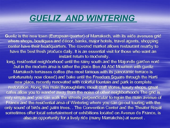GUELIZ AND WINTERING Gueliz is the new town (European quarter) of Marrakech, with its wide avenues grid where shops, boutiques and décor, banks, major hotels, travel agents, shopping center have their headquarters. The covered market allows restaurant nearby to have the best fresh produce daily. It is an essential visit for those who want an instant return to modernity. long, residential neighborhood until the rainy south and the Majorelle garden nord. but in the modern area is rather the place Ben Ali Abd Moumen with gueliz Marrakech terrasses coffee (the most famous with its panoramic terrace is unfortunately now closed) and bake until the Freedom Square through the Harti new place, recently renovated with colorful fountain and park in complete restoration. Along this main thoroughfare, moult craft stores, luxury shops, great cafes allow you to wander away from the noise of other neighborhoods The grid is very simple and you can walk the streets perpendicular to rejoin the main avenue of France and the residential area of Wintering where you can go out touring with the only sound of birds and palm trees. . The Convention Center and the Theater Royal sometimes offer local entertainment or exhibitions located on Avenue de France, is also an opportunity for a lively ride (many Marrakchis) at sunset.