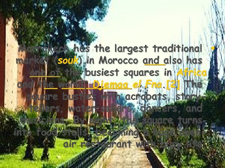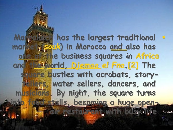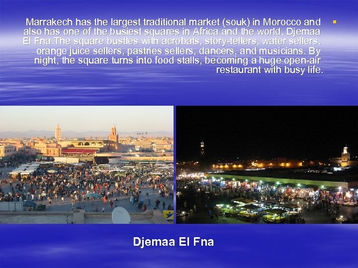Marrakech has the largest traditional § market (souk) in Morocco and also has one of the business squares in Africa and the world, Djemaa el Fna. [2] The square bustles with acrobats, storytellers, water sellers, dancers, and musicians. By night, the square turns into food stalls, becoming a huge openair restaurant with busy life.