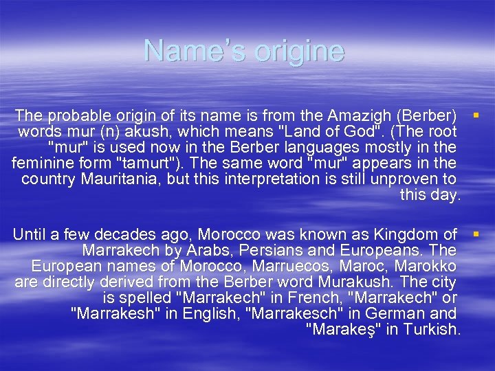 Name’s origine The probable origin of its name is from the Amazigh (Berber) § words mur (n) akush, which means "Land of God". (The root "mur" is used now in the Berber languages mostly in the feminine form "tamurt"). The same word "mur" appears in the country Mauritania, but this interpretation is still unproven to this day. Until a few decades ago, Morocco was known as Kingdom of § Marrakech by Arabs, Persians and Europeans. The European names of Morocco, Marruecos, Maroc, Marokko are directly derived from the Berber word Murakush. The city is spelled "Marrakech" in French, "Marrakech" or "Marrakesh" in English, "Marrakesch" in German and "Marakeş" in Turkish.